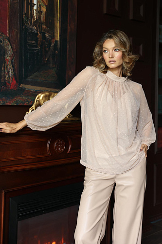 • Блузка с рукавом реглан. Воротник стойка с застежкой на 2 пуговицы. Сборка от воротника по переду. Топ в бельевом стиле в комплекте.