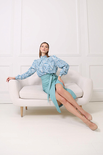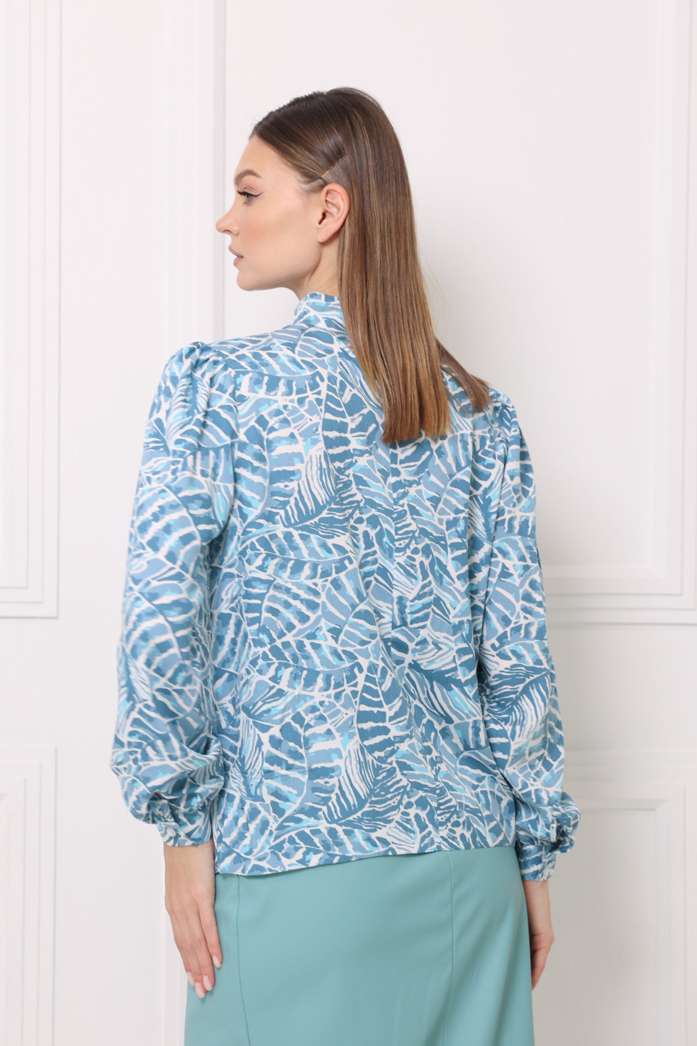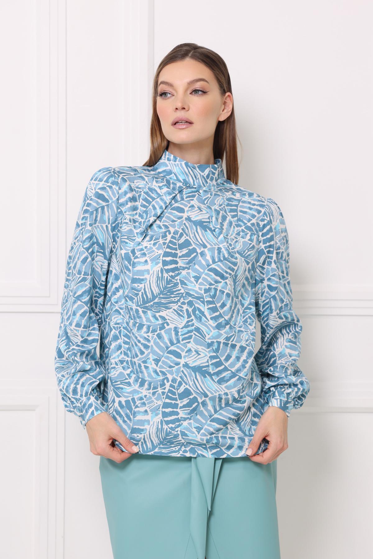 Блузка с высоким воротом стойкой и застежкой на 2 пуговицы. Защипы от воротника по переду. Втачной рукав с манжетой на пуговице.
