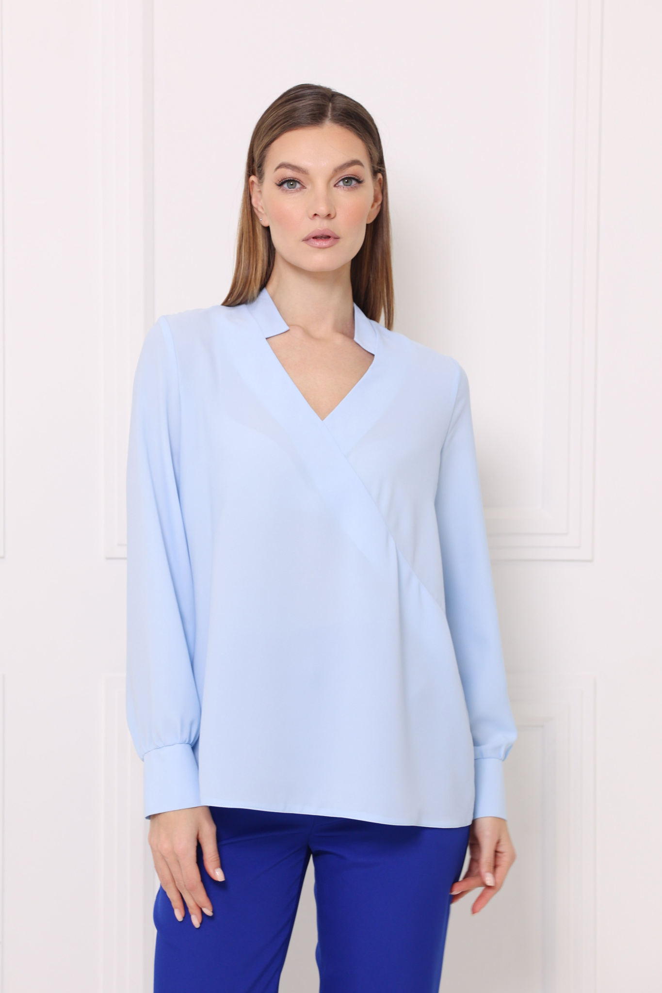 Блузка прямого кроя выполнена с эффектом запАха. Фигурный ворот. Длинный, втачной рукав на широкой манжете. Изделие без застёжки.