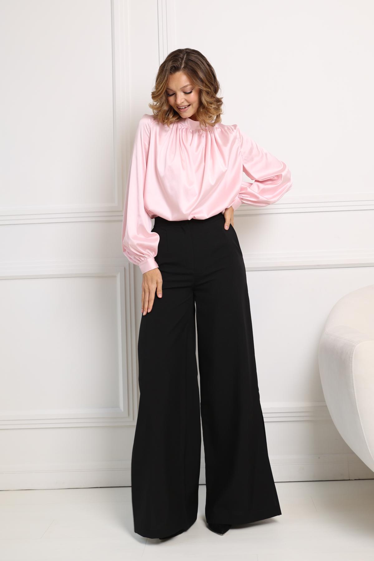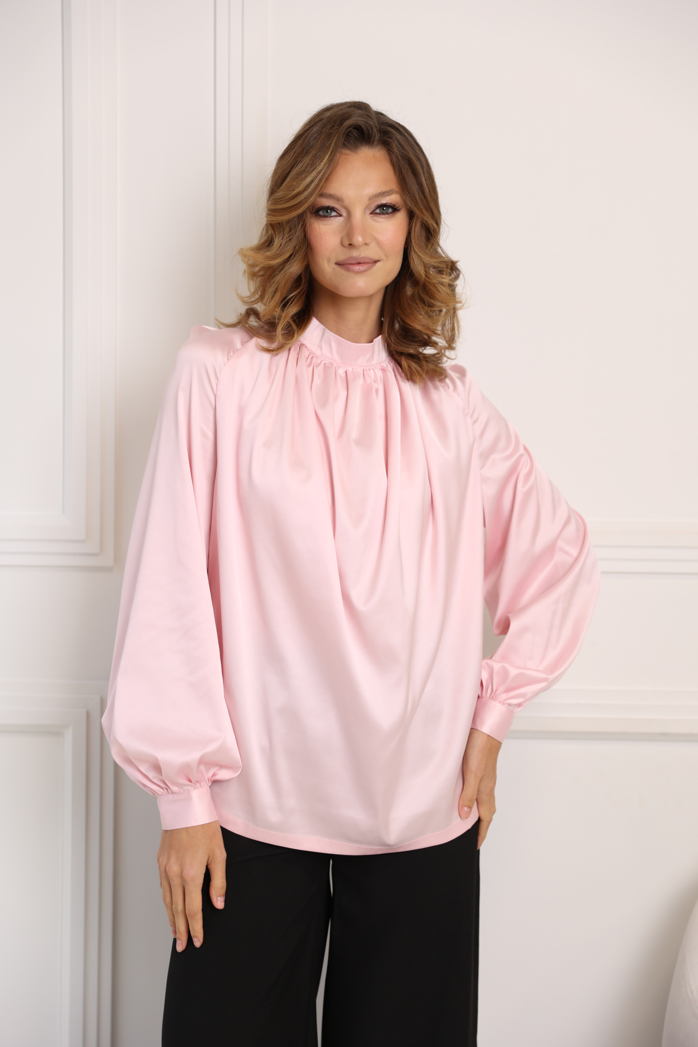 • Блузка с рукавом реглан и манжетой на пуговице. Воротник стойка с застёжкой на 2 пуговицы. Сборка от воротника по переду.