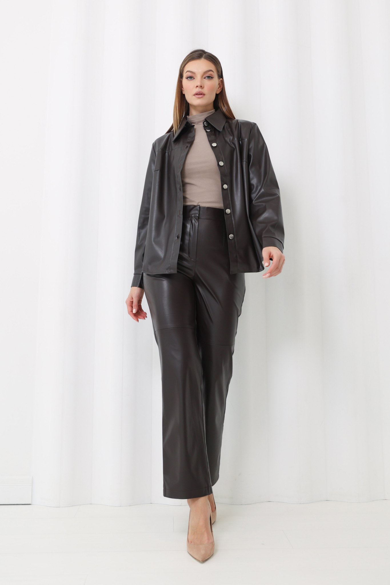 Рубашка из экокожи на пуговицах прямого кроя с фигурным низом, втачным рукавом и манжетой, отложным воротником и кокеткой по переду и спинке.