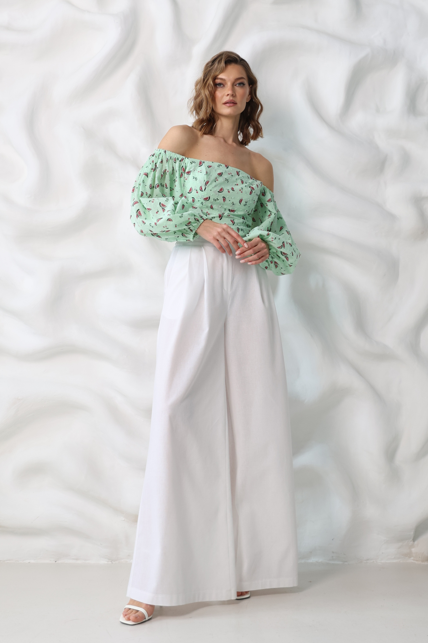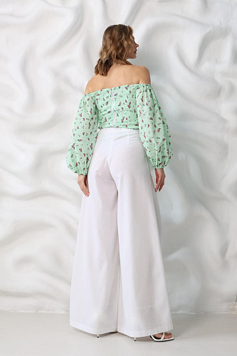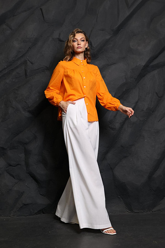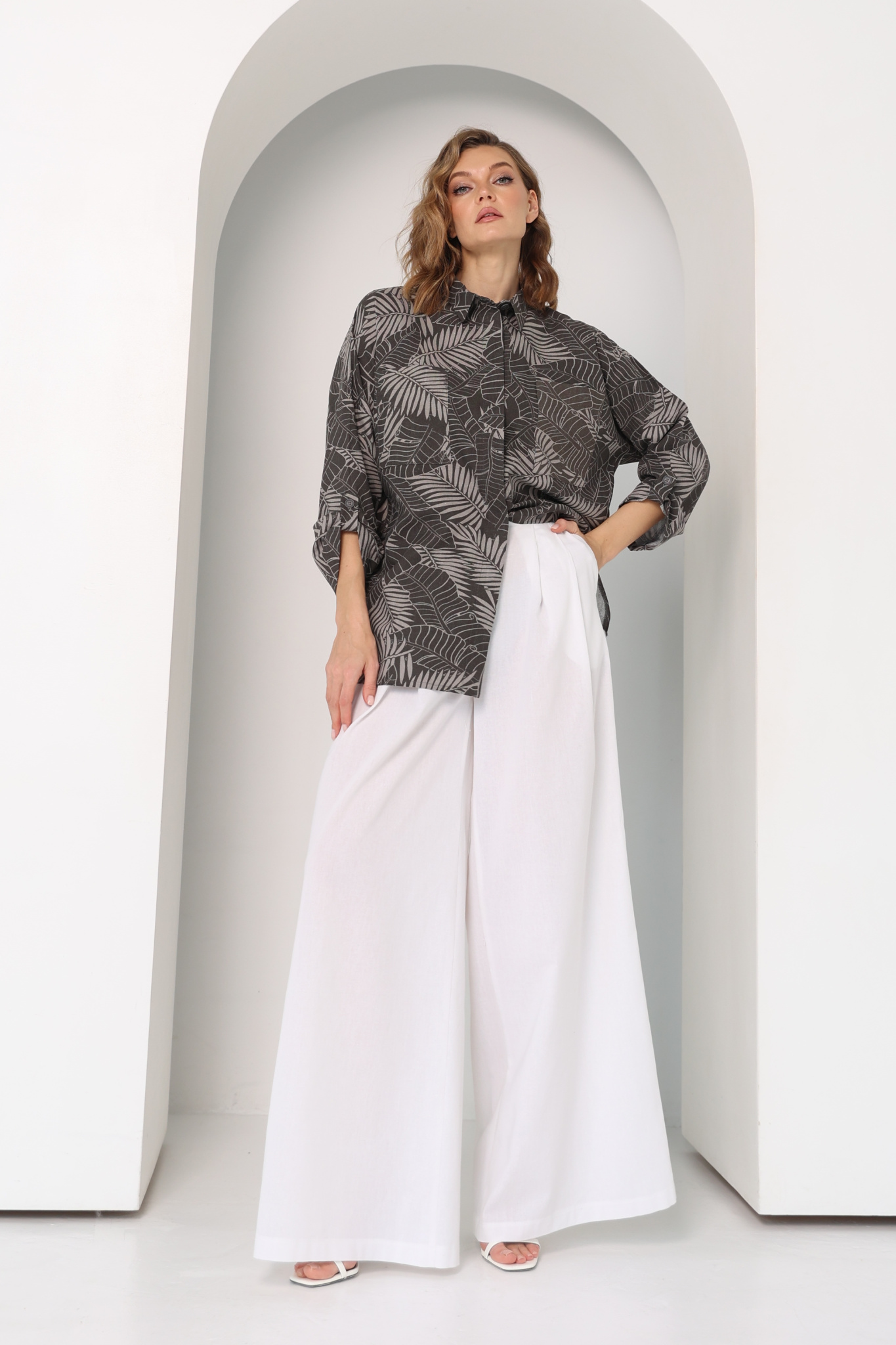 Брюки-палаццо с притачным поясом и защипами по линии талии. Карманы в боковых швах. Застёжка на молнию и пуговицу. Резинка на поясе сзади для идеальной посадки.