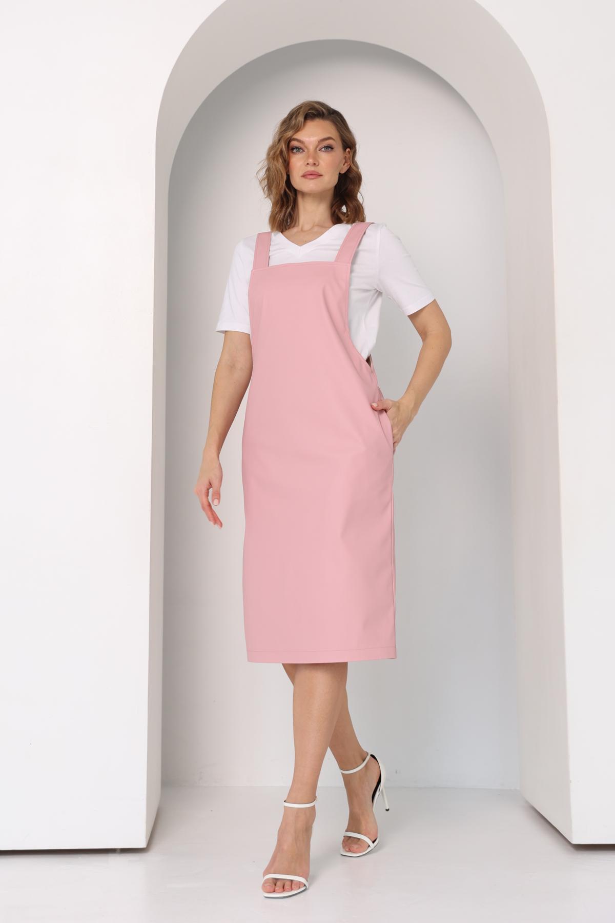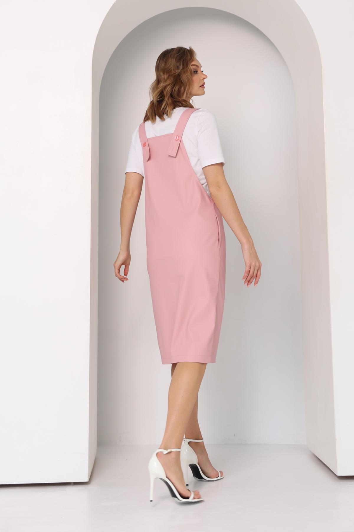 Сарафан прямого кроя на бретелях, с углубленной проймой и карманами в боковых швах. Бретели регулируются по длине с помощью дополнительной петли для пуговицы.