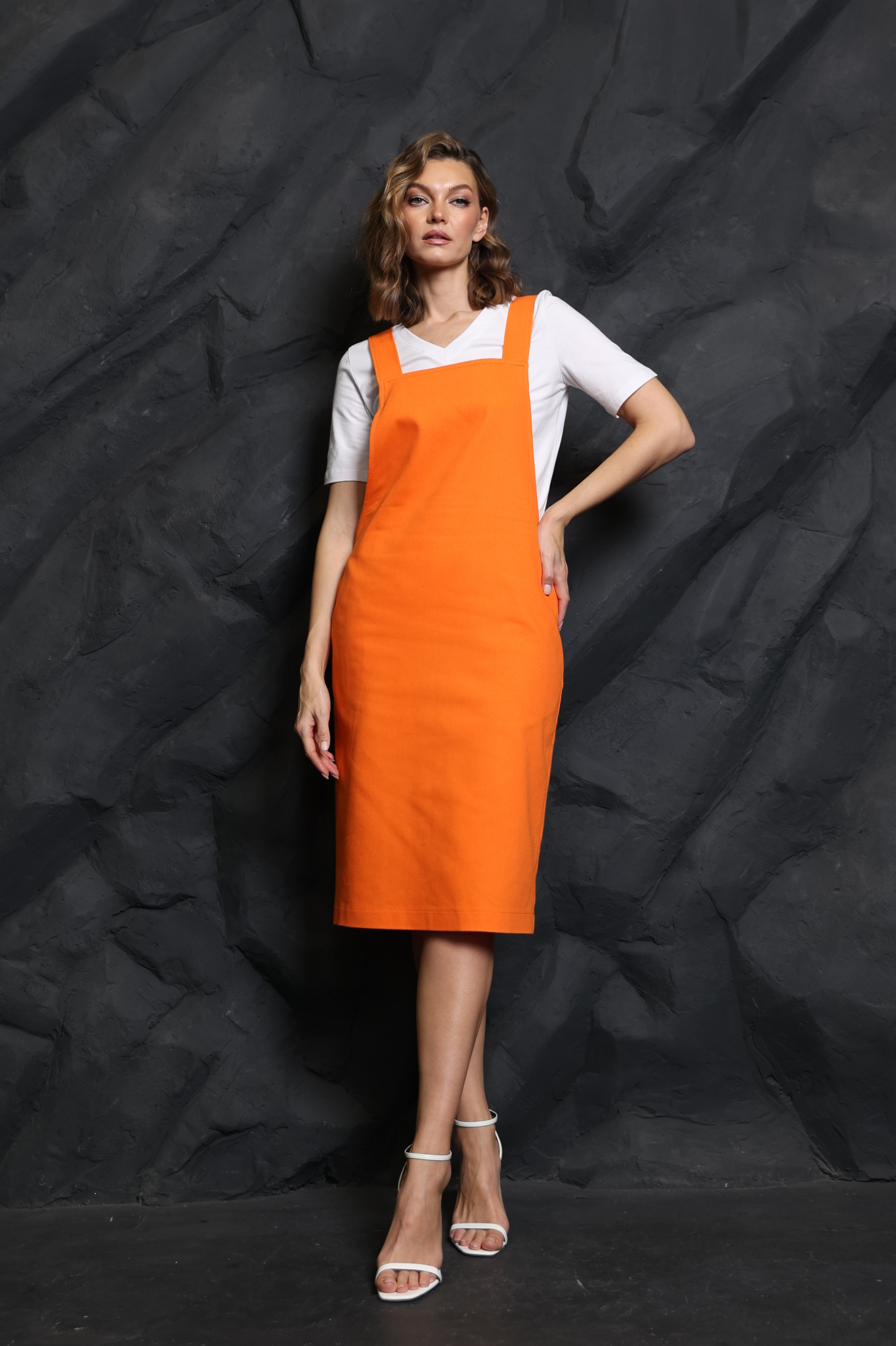 • Сарафан прямого кроя на бретелях, с углубленной проймой и карманами в боковых швах. Бретели регулируются по длине с помощью дополнительной