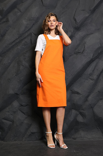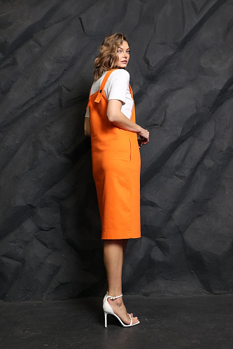 Сарафан прямого кроя на бретелях, с углубленной проймой и карманами в боковых швах. Бретели регулируются по длине с помощью дополнительной