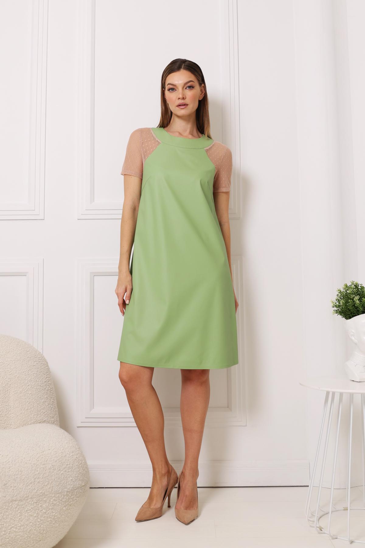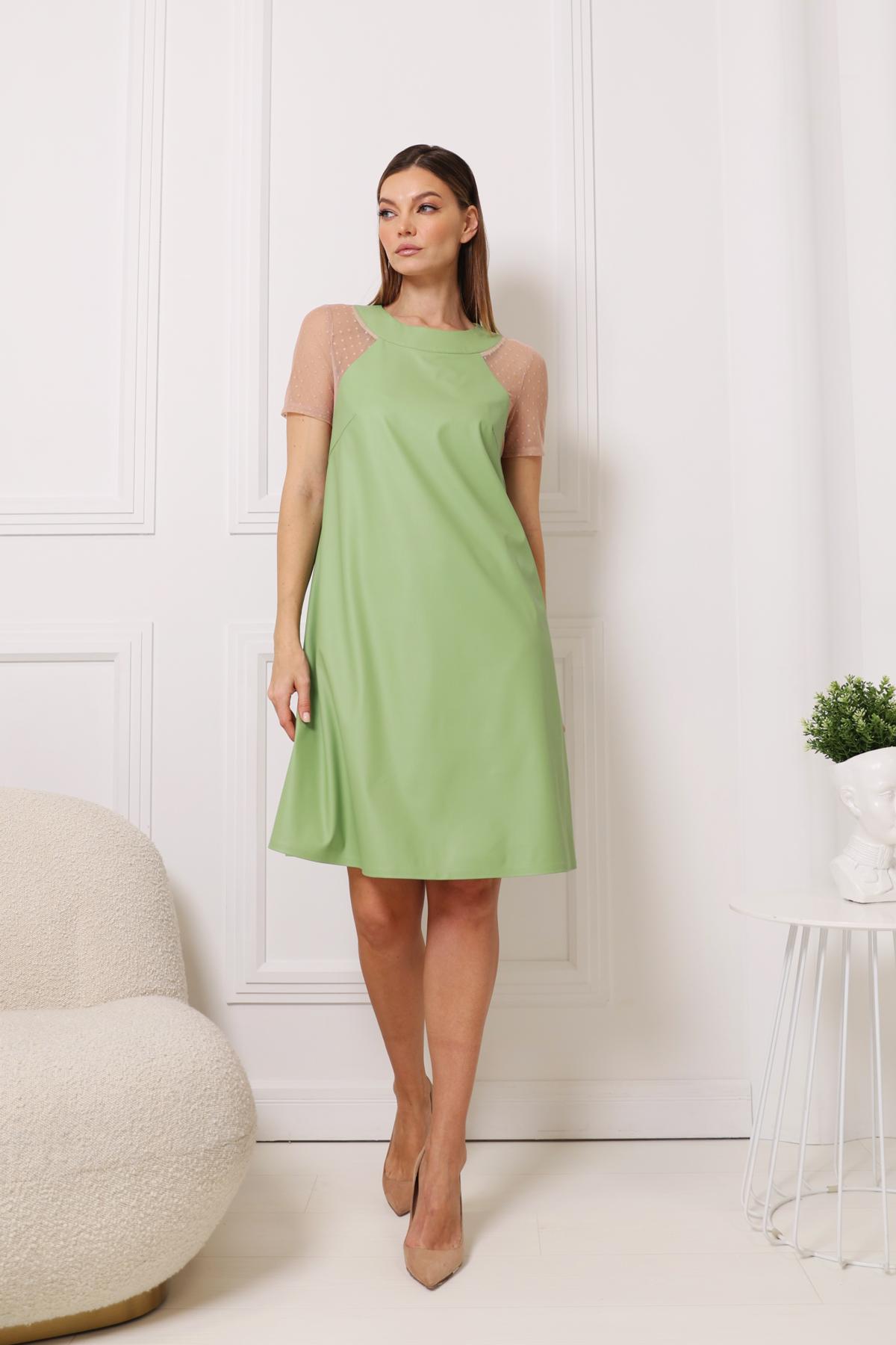 Платье А-силуэта из экокожи. Круглая горловина. Рукав реглан из сетки-фатина. Застёжка на пуговицы.