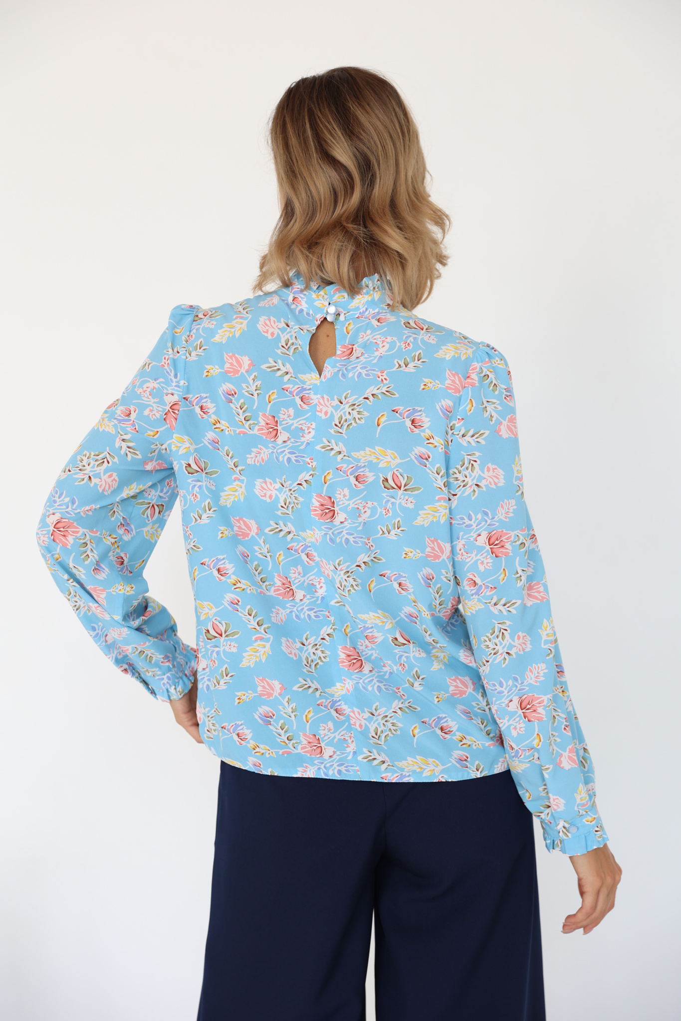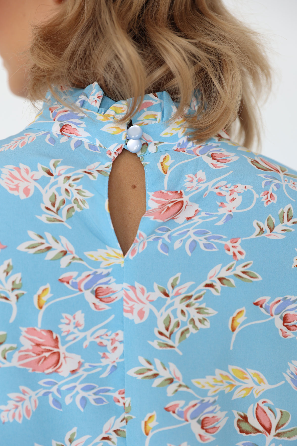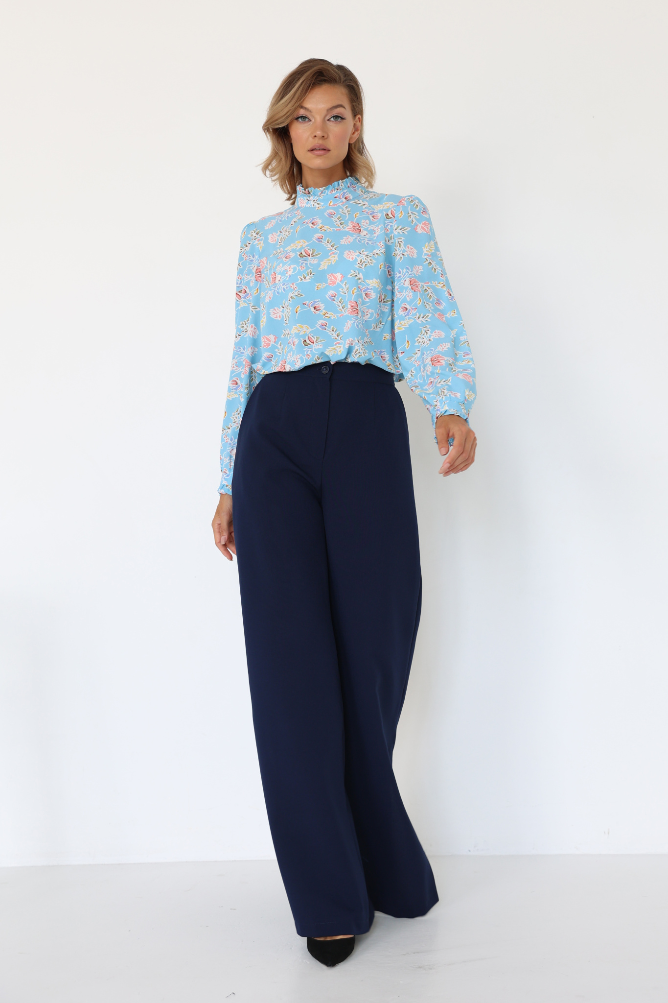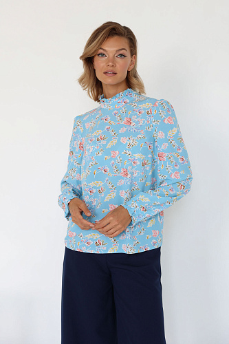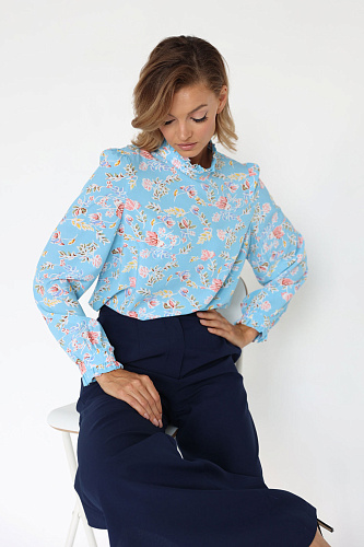 Блузка прямого кроя с воротом стойкой выполненным в виде рюши. Застёгивается на пуговку на спинке горловины. Манжет втачного рукава так же дополнен рюшей из основной ткани блузки.