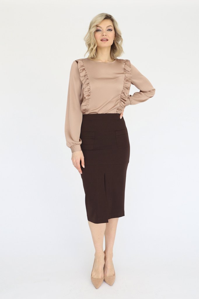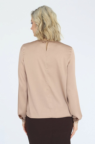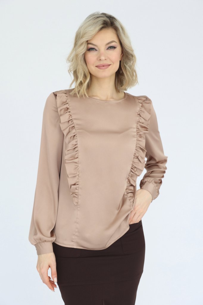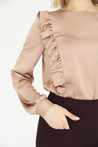 Блузка из искусственного шелка с круглым вырезом горловины и рюшами. Рукав с манжетой, застегивающейся на 1 пуговицу