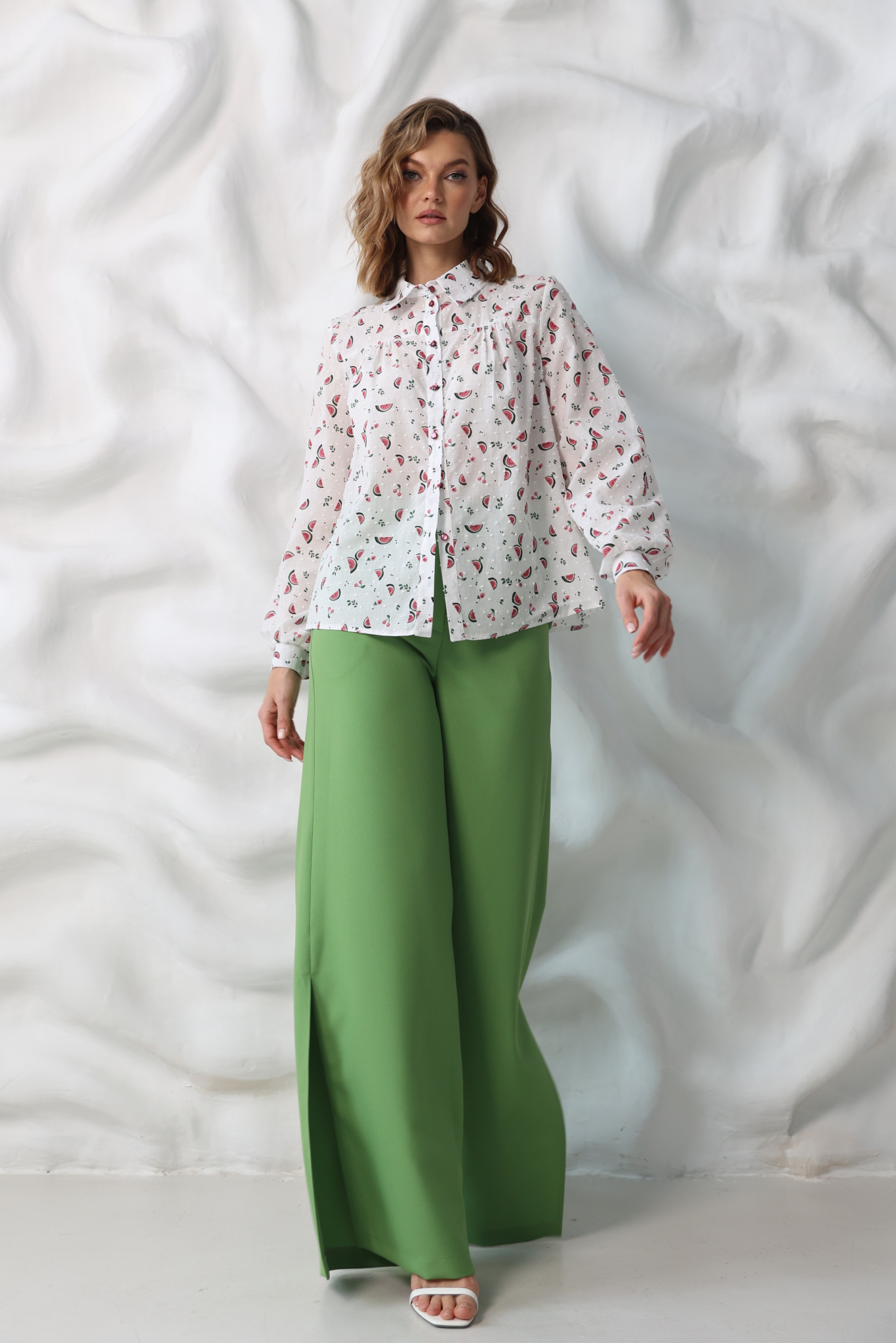Параметры модели: 175 см, грудь 86 см, талия 66 см, бедра 96 см.