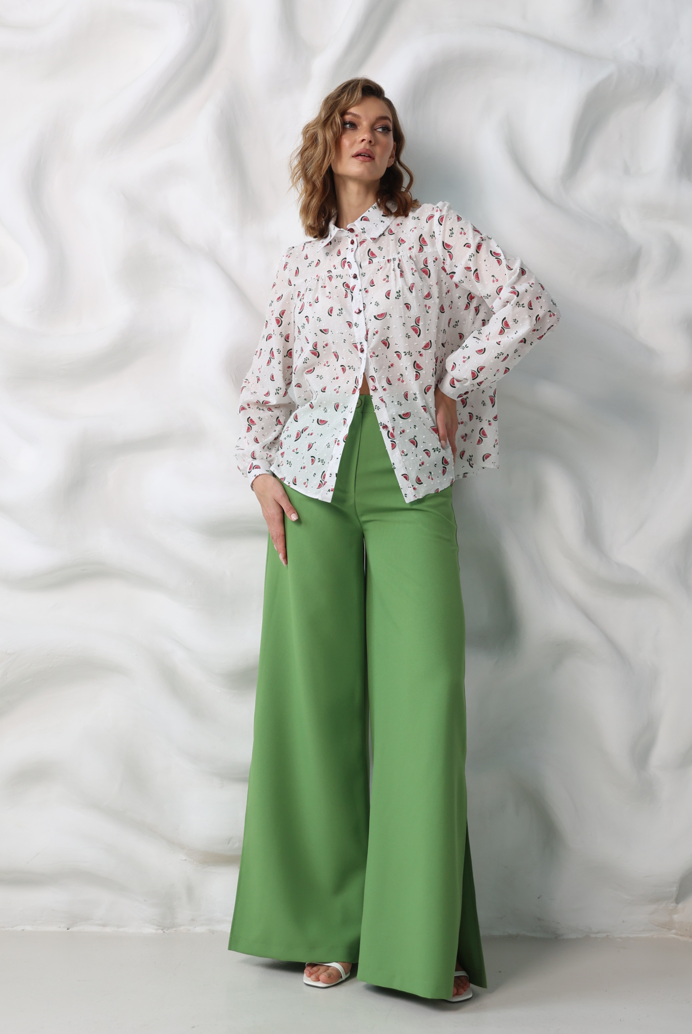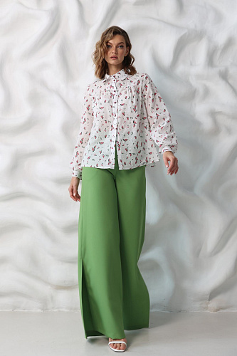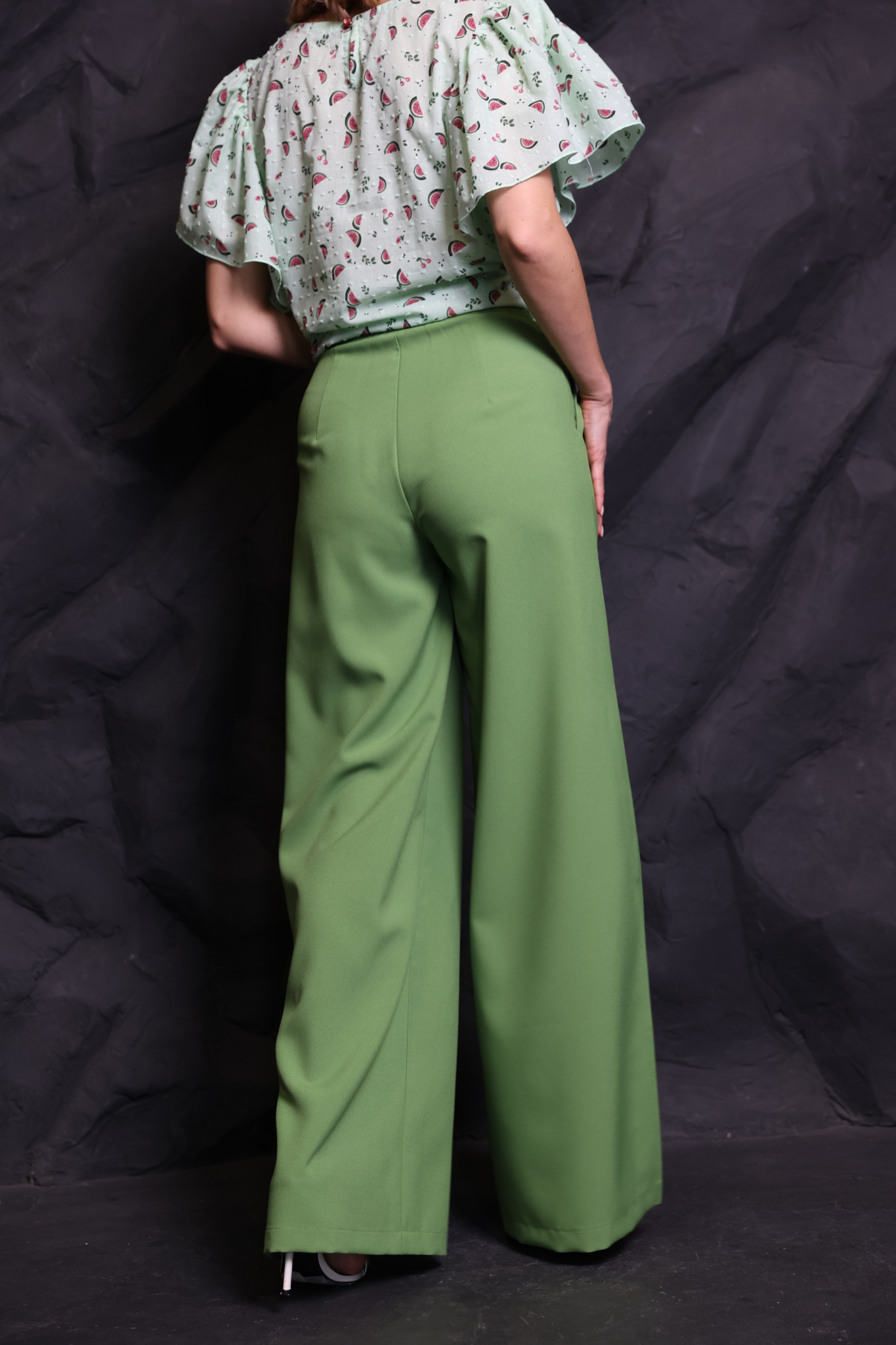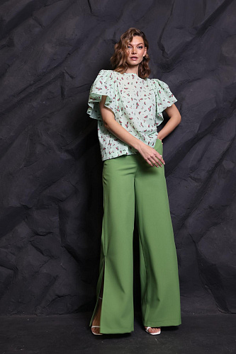 • Брюки палаццо с разрезами на штанинах по боковым швам. Притачной пояс с резинкой по талии сзади. Карманы.