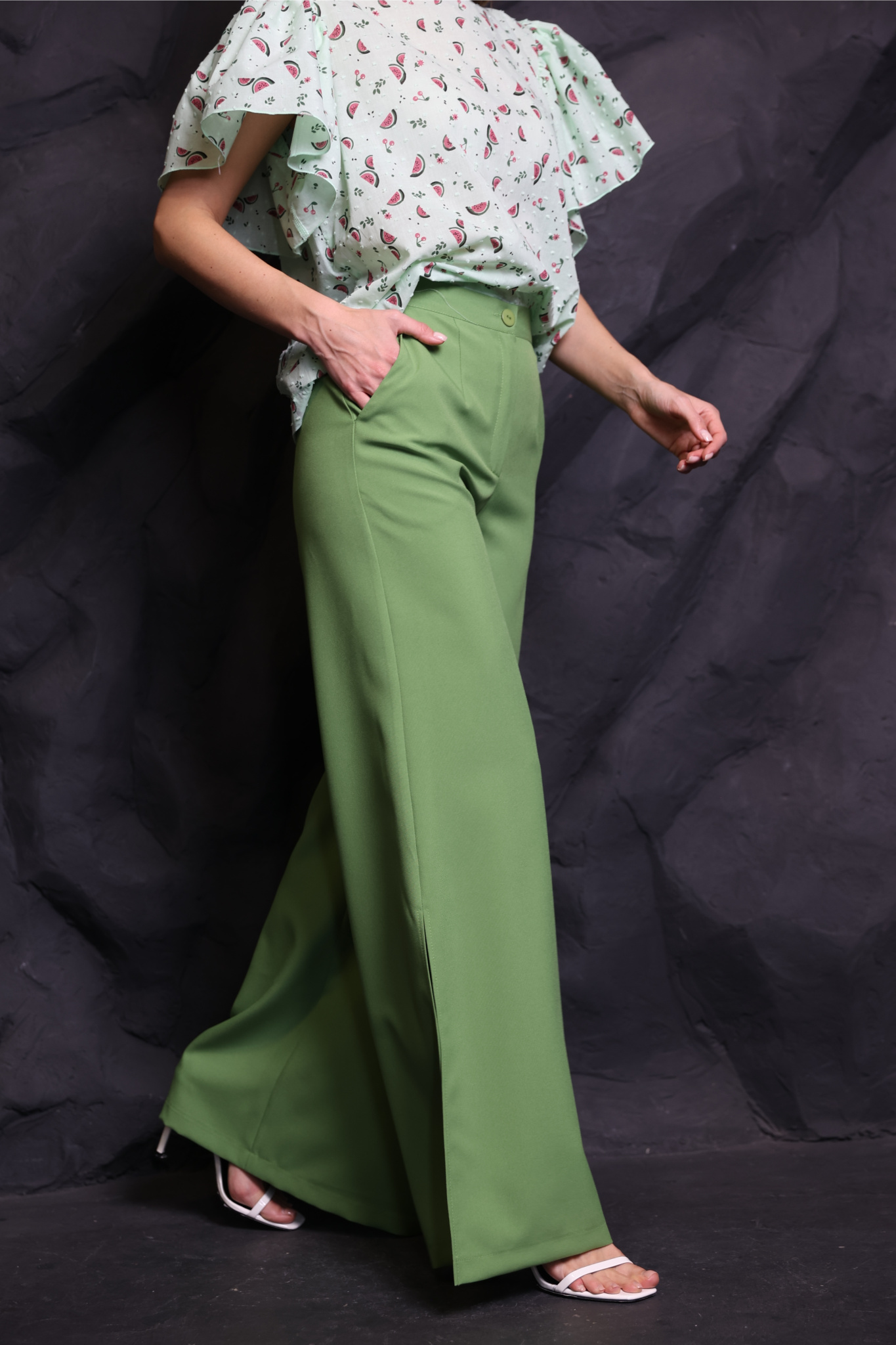 Брюки палаццо с разрезами на штанинах по боковым швам. Притачной пояс с резинкой по талии сзади. Карманы.