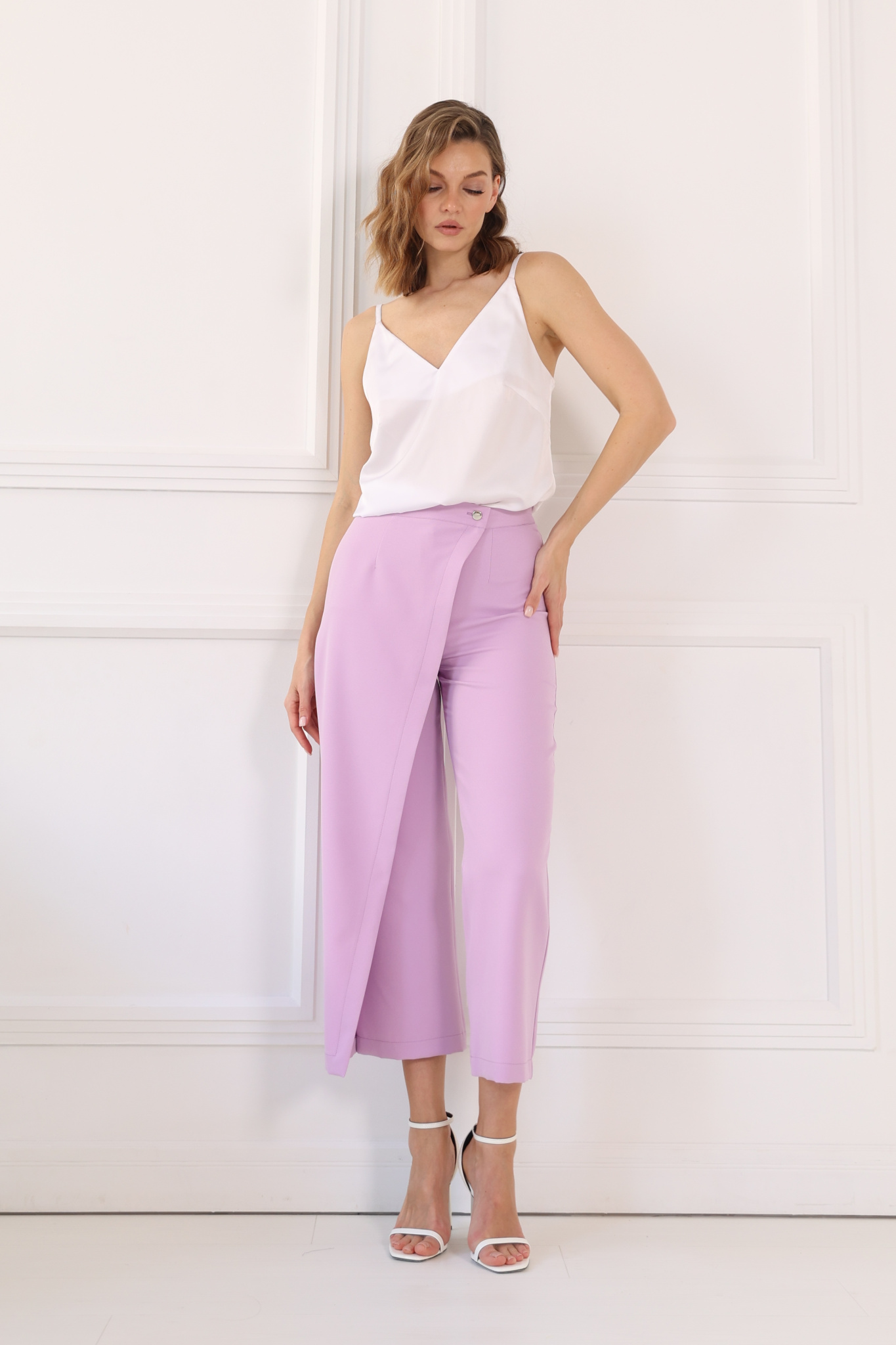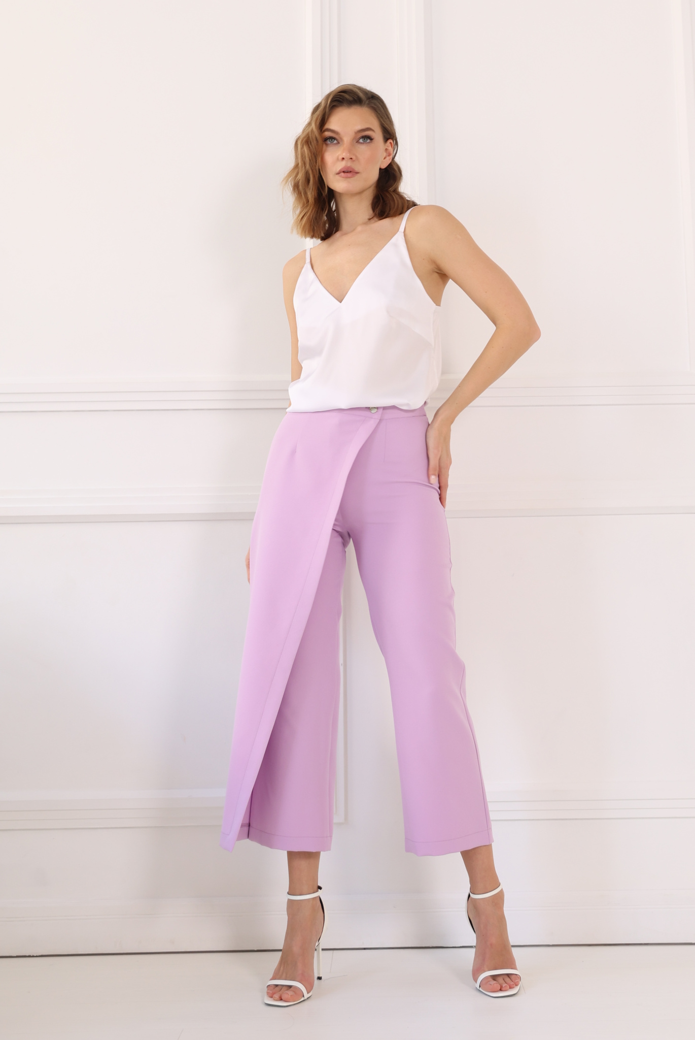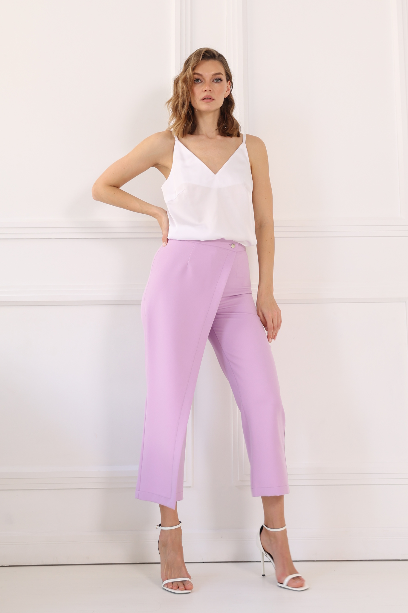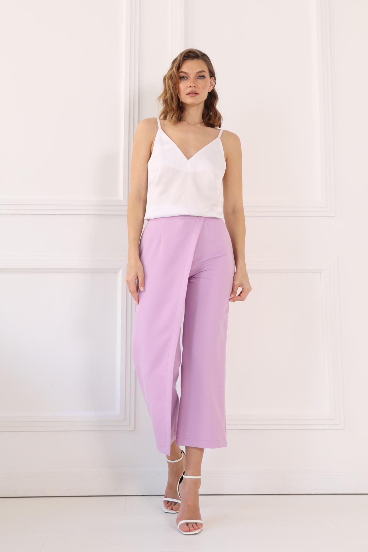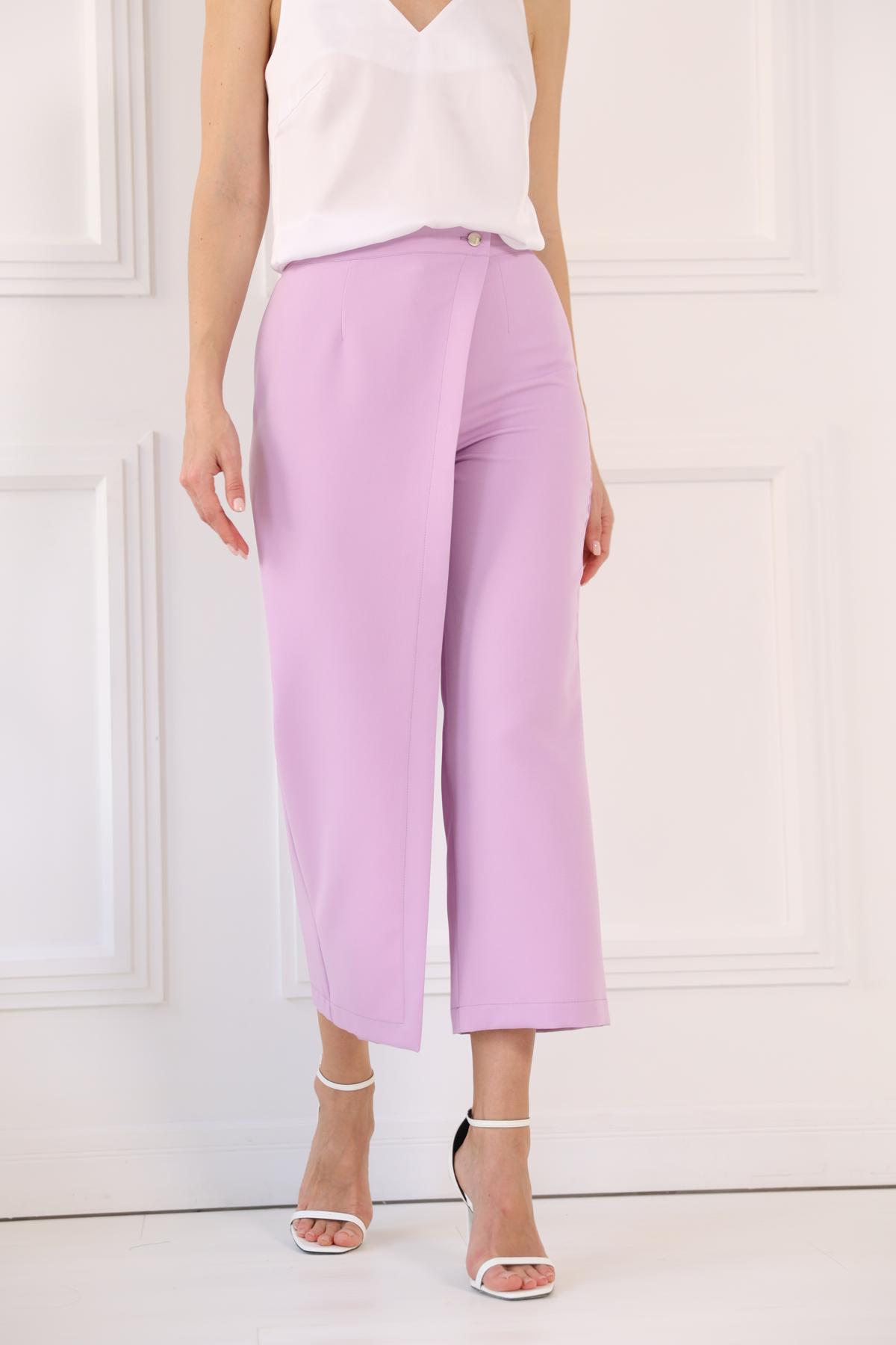 Укороченные брюки с имитацией запАха. Слегка расклёшенные книзу. Притачной пояс. Карманы в боковых швах.