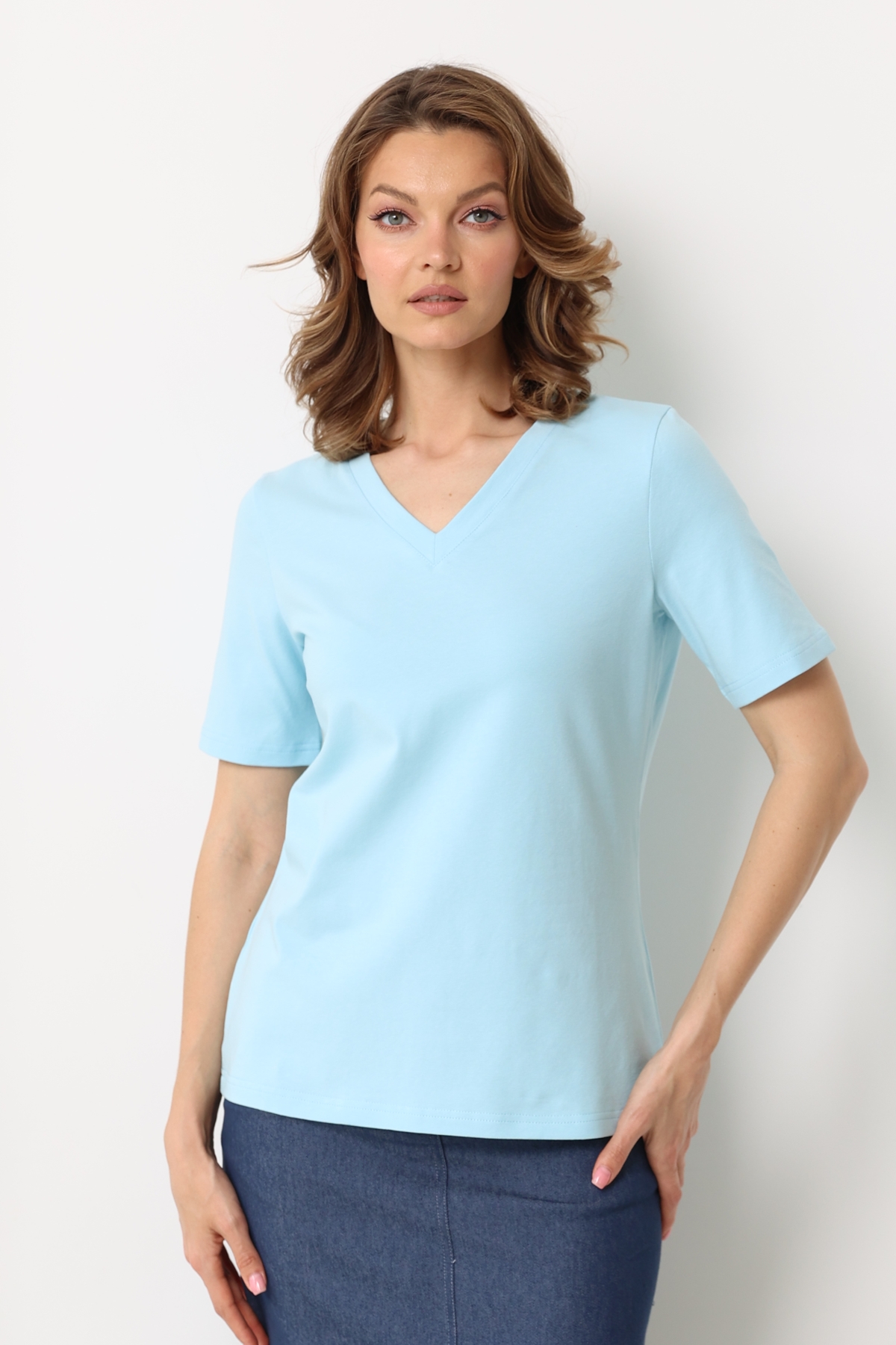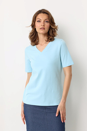 Футболка с V-образным вырезом. Прямой крой, классический короткий рукав с отстрочкой по низу. Футболка выполнена из легкого приятного к телу трикотажа на основе хлопка с добавлением лайкры.