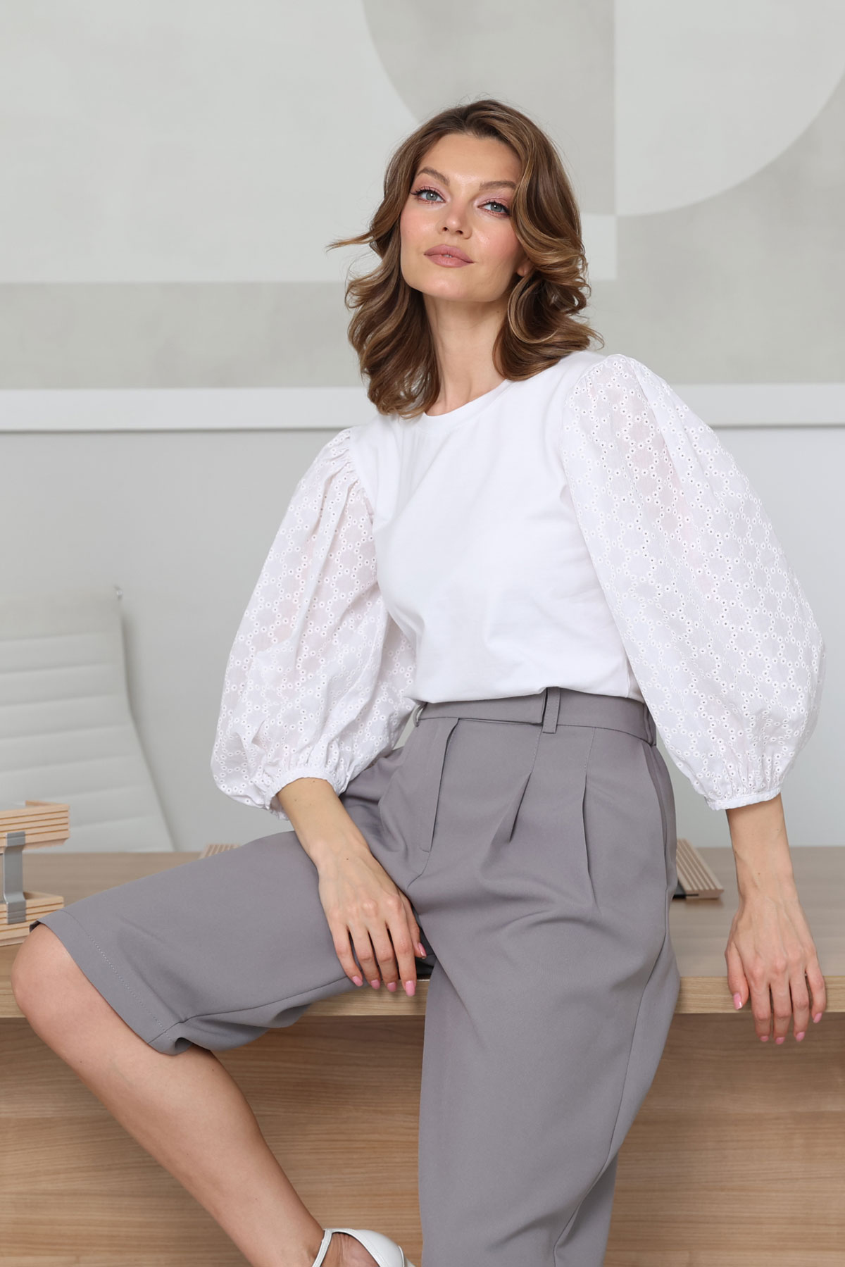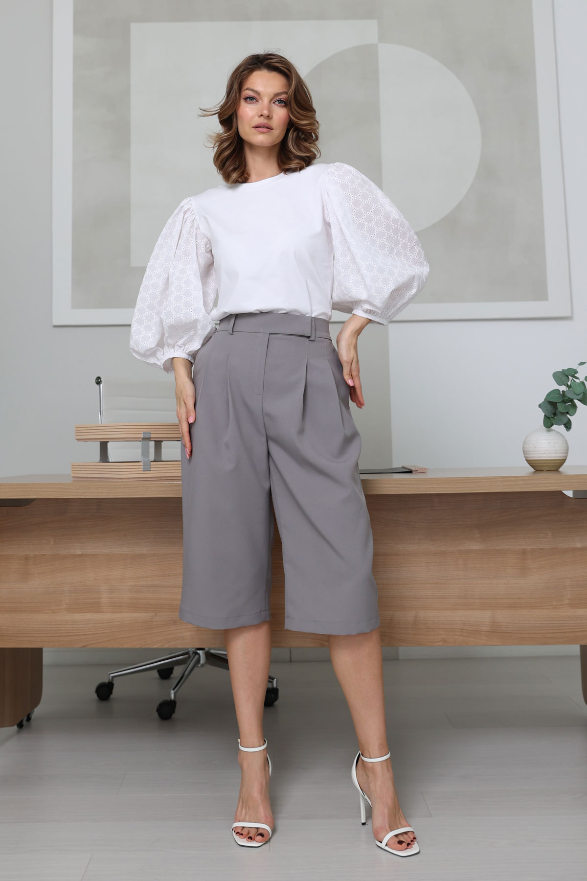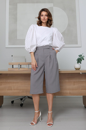 Прямые шорты удлинённого кроя. Притачной пояс со шлёвками. Защипы по переду и резинка на талии сзади. Карманы в боковых швах.