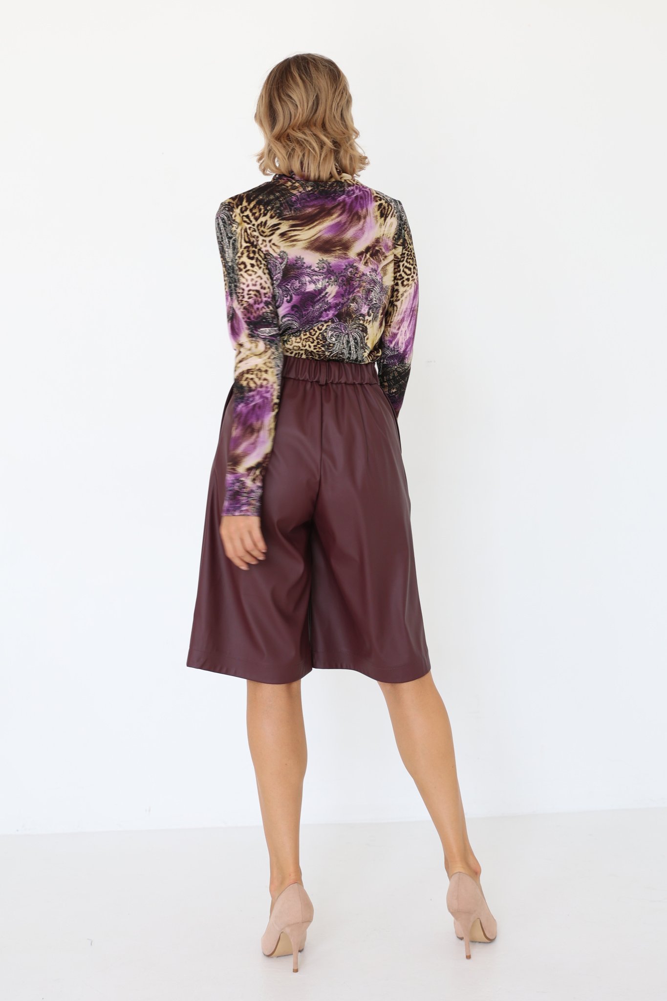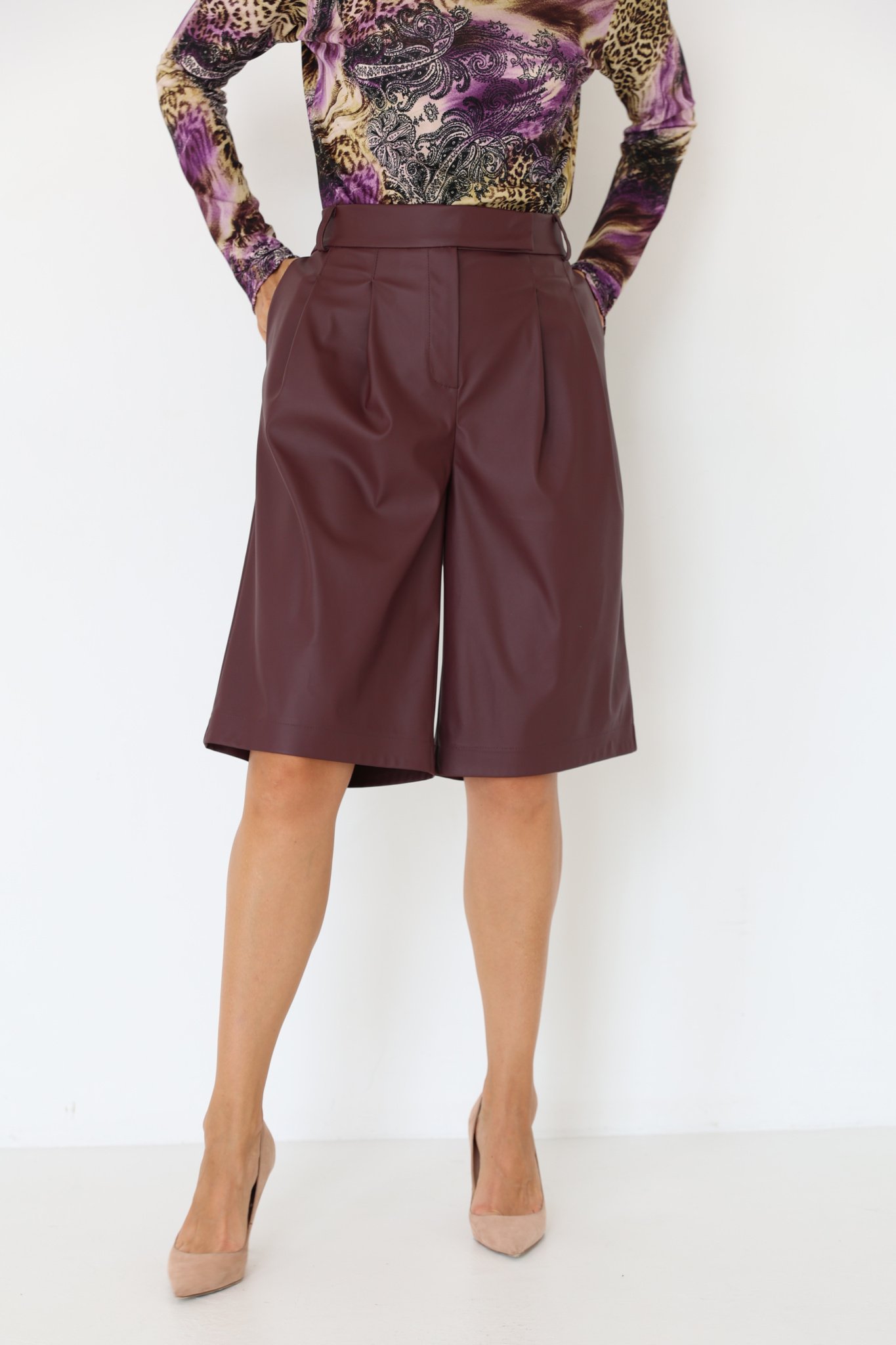 • Шорты из искусственной кожи с притачным поясом и резинкой со стороны спинки. Боковые карманы в швах, застежка на молнию и крючок, шлевки на поясе.