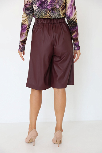 Шорты из искусственной кожи с притачным поясом и резинкой со стороны спинки. Боковые карманы в швах, застежка на молнию и крючок, шлевки на поясе.