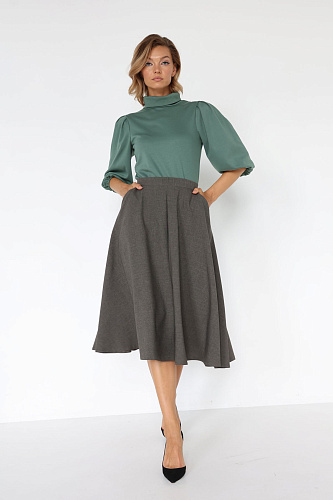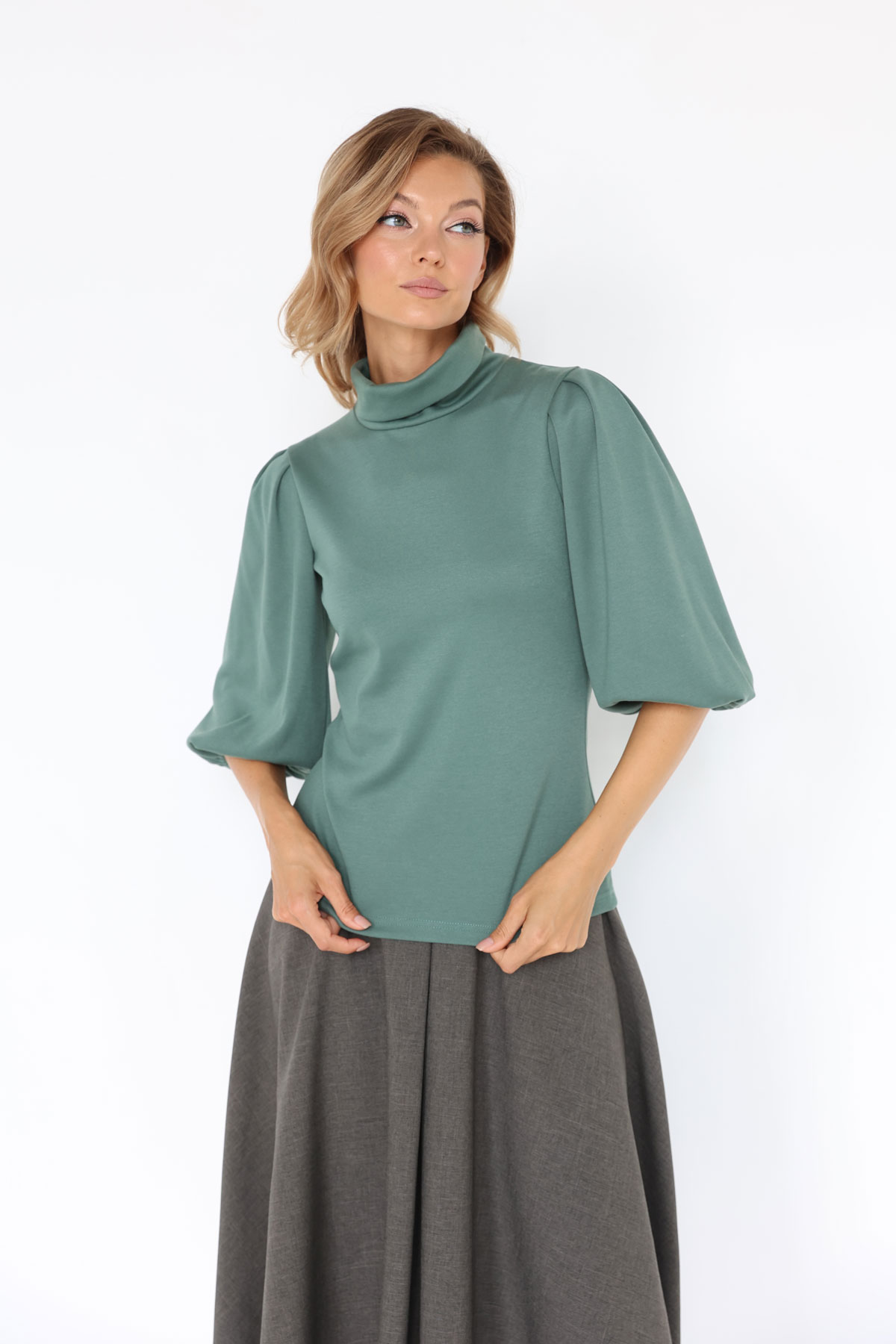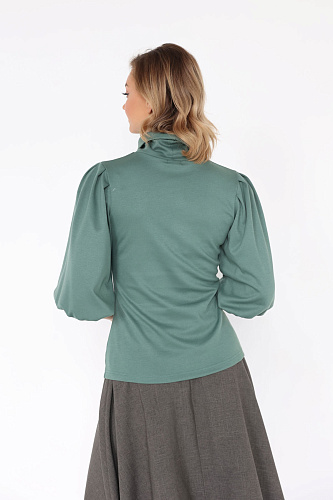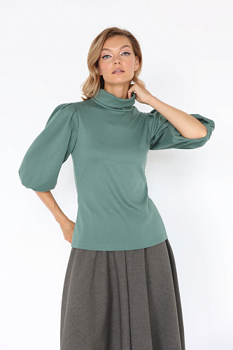 Водолазка приталенного силуэта. Втачной, пышный рукав длинной ¾ со сборкой по окату и манжетой на резинке. Ворот с отворотом.