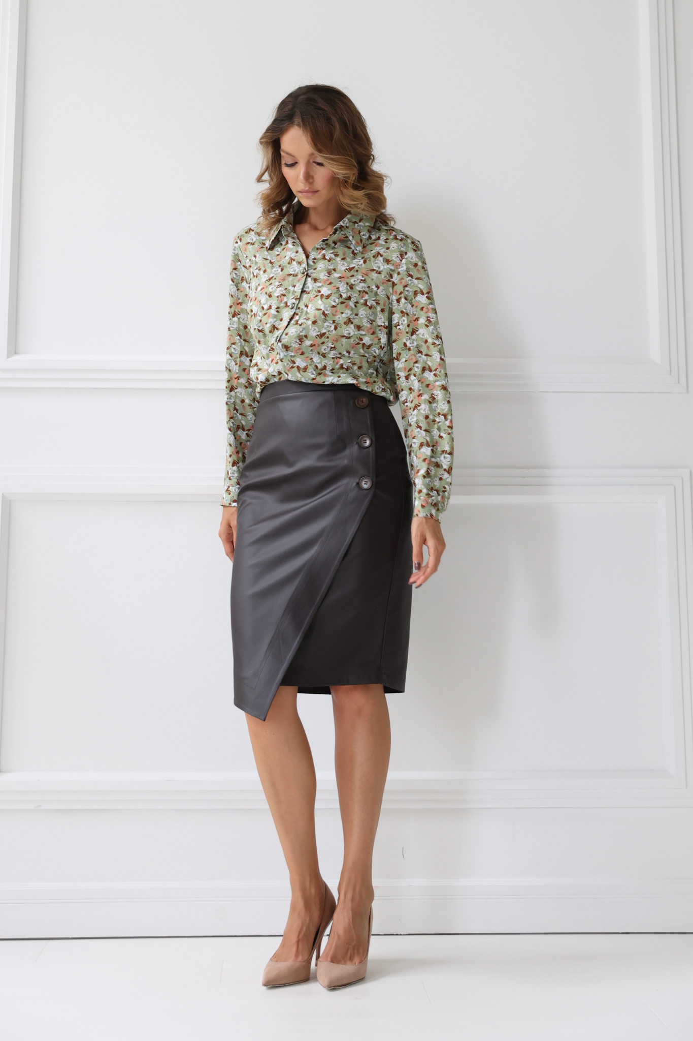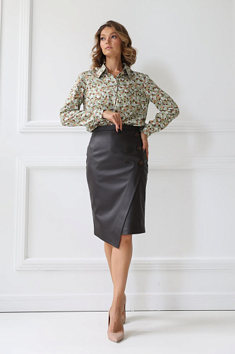 • Юбка из экокожи с полукруглым, асимметричным запАхом и пуговицами. Изделие выполнено на подкладке.