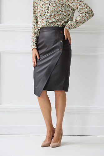 Юбка из экокожи с полукруглым, асимметричным запАхом и пуговицами. Изделие выполнено на подкладке.