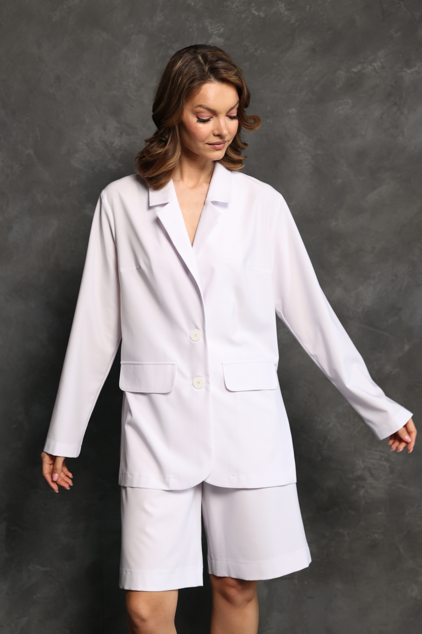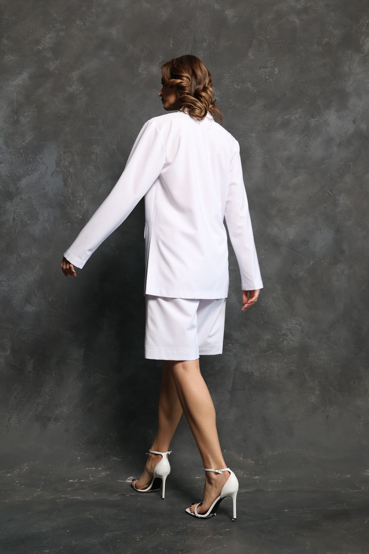 • Жакет из тонкой костюмной ткани прямого силуэта с застежкой на пуговицы и отложным воротником с лацканами. Фальш-карманы по переду, разрезы в боковых швах. Жакет выполнен без подкладки.