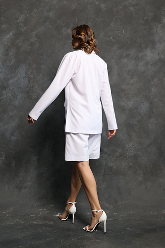 Жакет из тонкой костюмной ткани прямого силуэта с застежкой на пуговицы и отложным воротником с лацканами. Фальш-карманы по переду, разрезы в боковых швах. Жакет выполнен без подкладки.